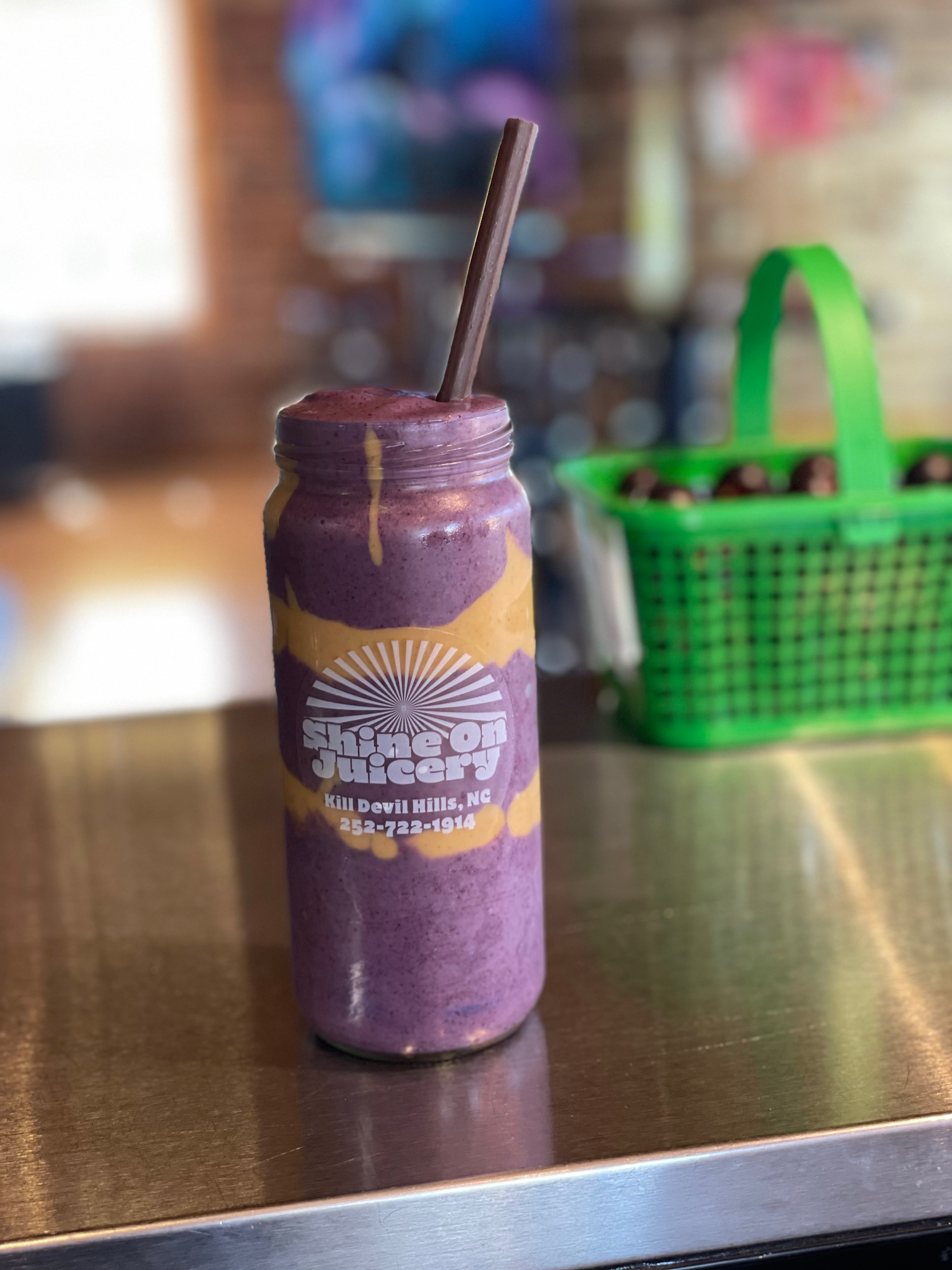 banana, house cashew mylk, cacao, peanut butter, hemp seed, flax seed, Maca, date and vanilla maple